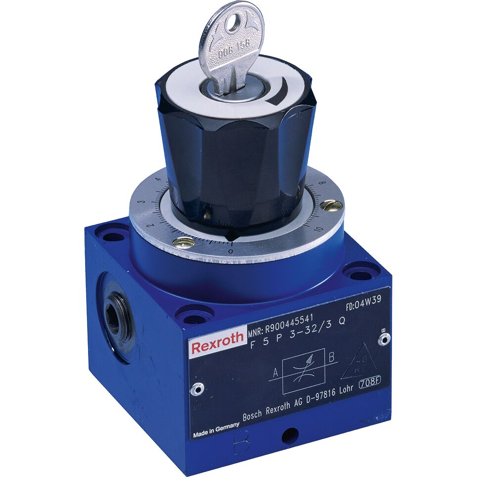 As válvulas reguladoras da Bosch Rexroth reduzem a capacidade de fluxo em um sistema hidráulico para um valor ajustado mecanicamente e, assim, reduzem a velocidade dos acionamentos hidráulicos.